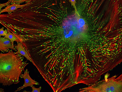 In this image, DNA has been stained blue, so the large clumps of blue just above centre are the cell's nucleus. Red lines are filaments of actin spread throughout the cell, while the green patches at their tips are the focal adhesions.