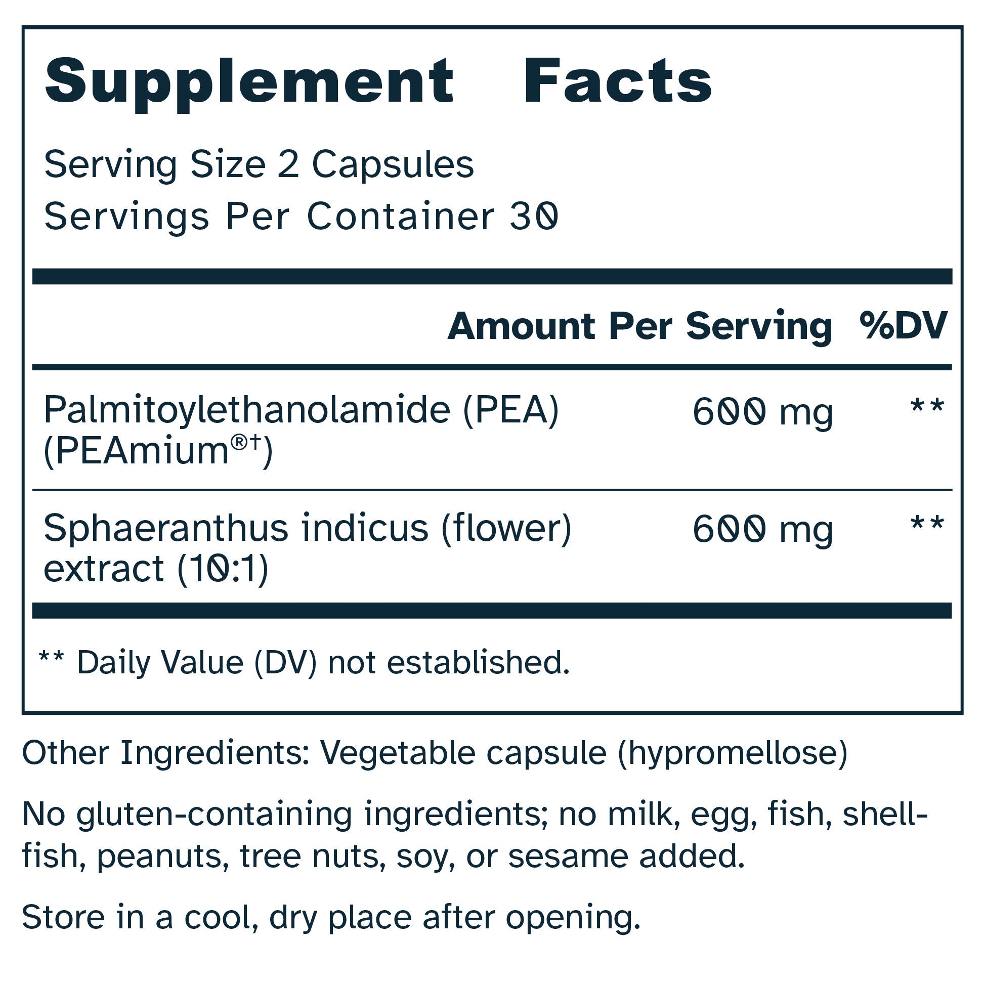 • Supplement facts label with PEA and Sphaeranthus indicus extract on a white background