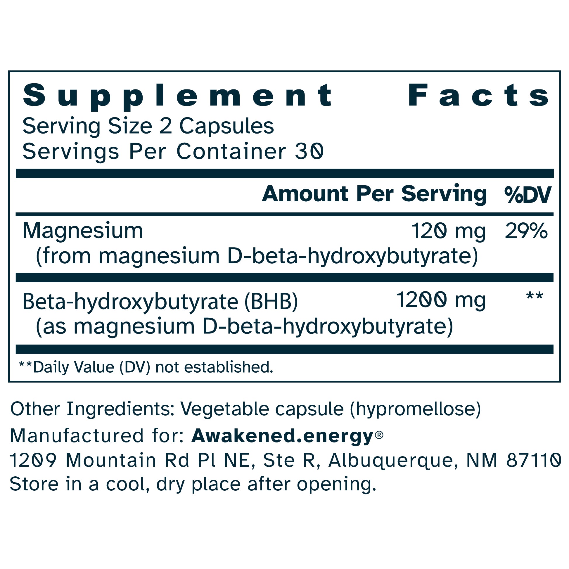 For optimal results, take 2 capsules of Awakened.energy Mg-BHB daily, preferably with a meal or as directed by your healthcare professional. Consistency is key to unlocking your full potential.